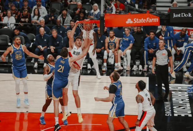9分6板1帽!杨瀚森又创1新高!开拓者遭18分大逆转,库里轰28分